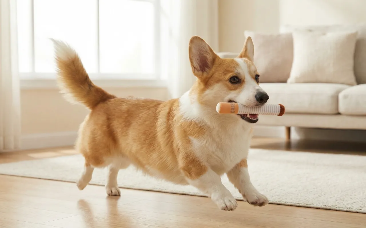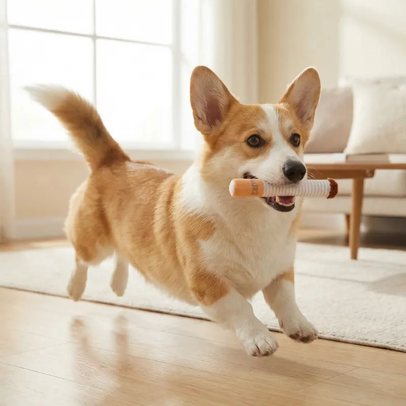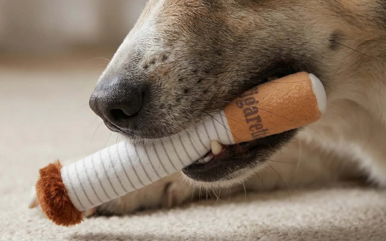 Habe diese albernen Zigaretten-Spielzeuge für meinen Hund gekauft, und jetzt stolziert er stolz damit durchs Haus, quietscht ununterbrochen und bringt alle zum Lachen.