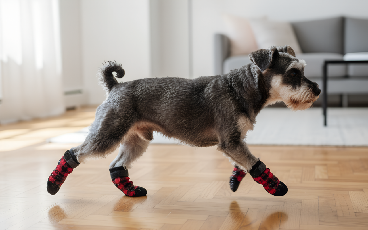 Buddys Hinterbeine rutschen, weil er alt ist, aber diese Socken geben ihm Halt. Er geht sicherer und ist auf glatten Böden weniger nervös.