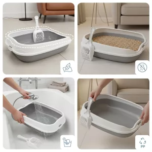Dieses Klo macht das Saubermachen bei meinen zwei Katzen viel einfacher. Die Schaufel ist wirklich praktisch und die Antihaft-Oberfläche lässt sich schnell abwischen.