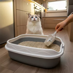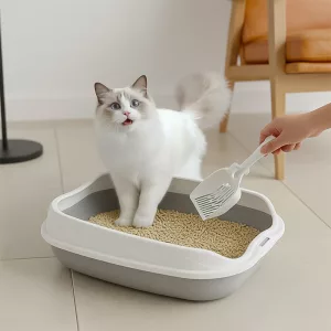 Katzentoilette mit hohen Seitenwänden und Schaufel