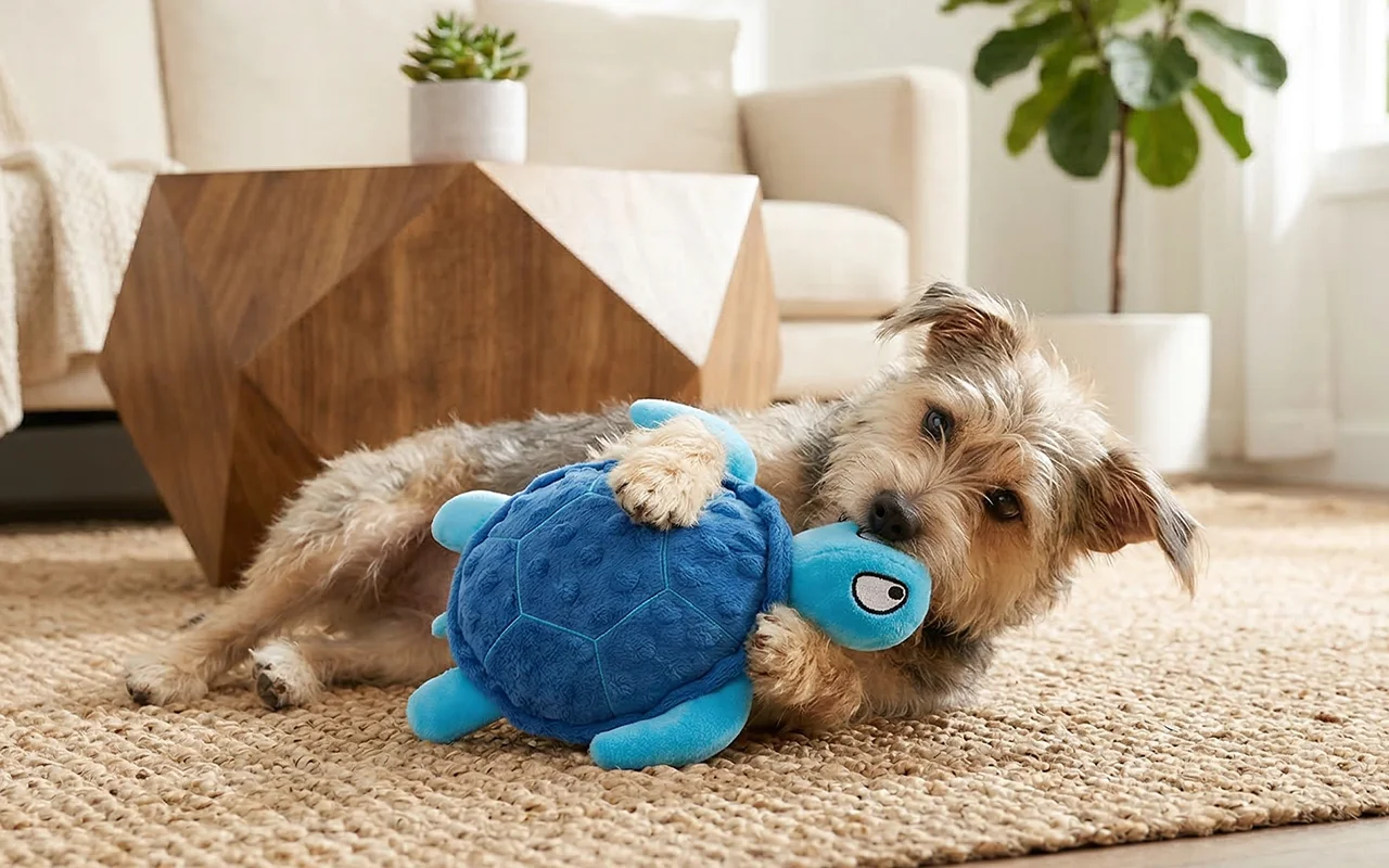 Unser Hund zerstört Spielzeug normalerweise innerhalb von Stunden, aber diese Schildkröte hält überraschend gut. Die Mischung aus Quietschen und Knistern beschäftigt ihn den ganzen Abend.
