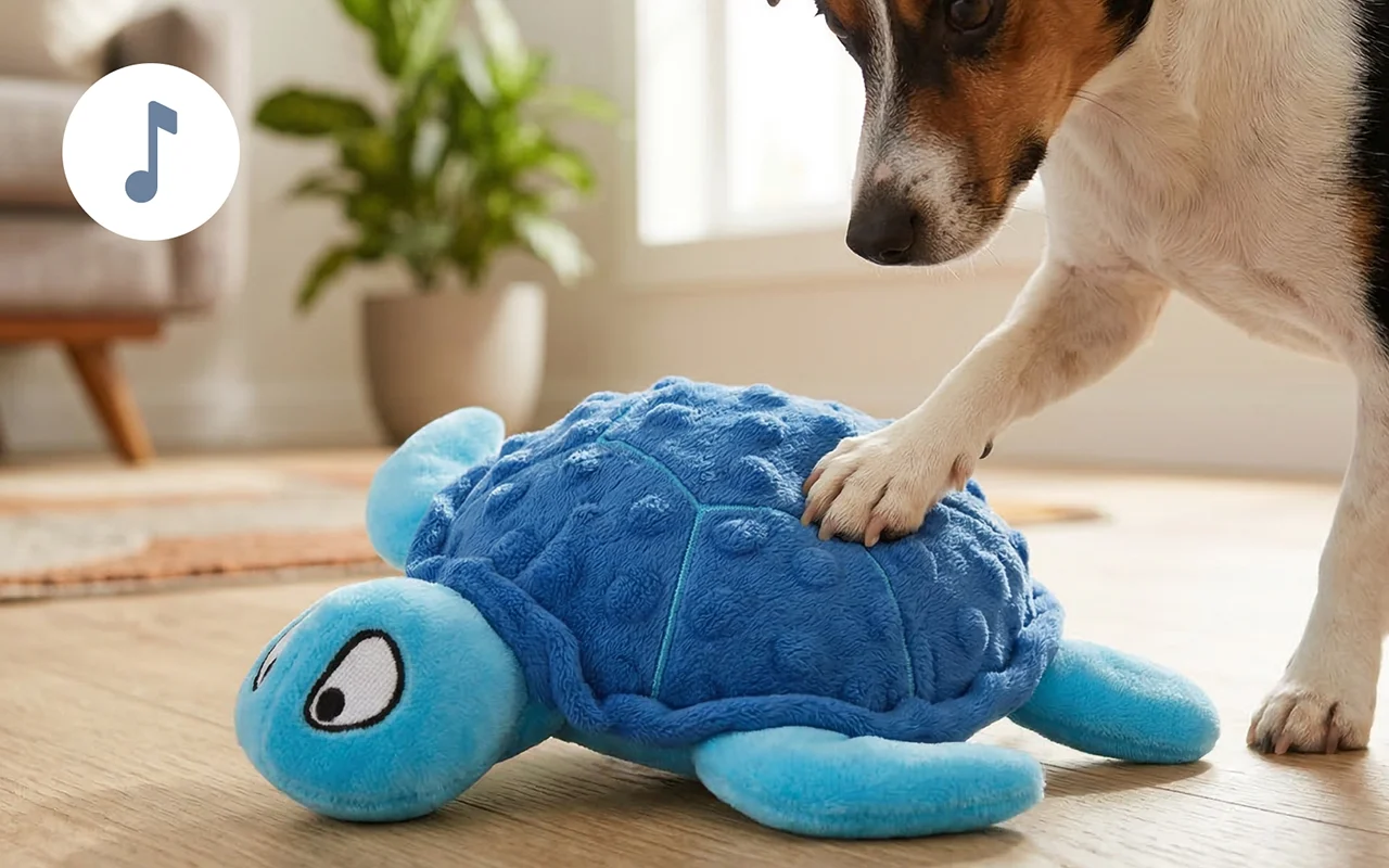 Ich habe diese niedliche Schildkröte für meinen Hund gekauft und er ist besessen davon. Das Quietschen und das knisternde Geräusch beschäftigen ihn, während ich das Abendessen koche.