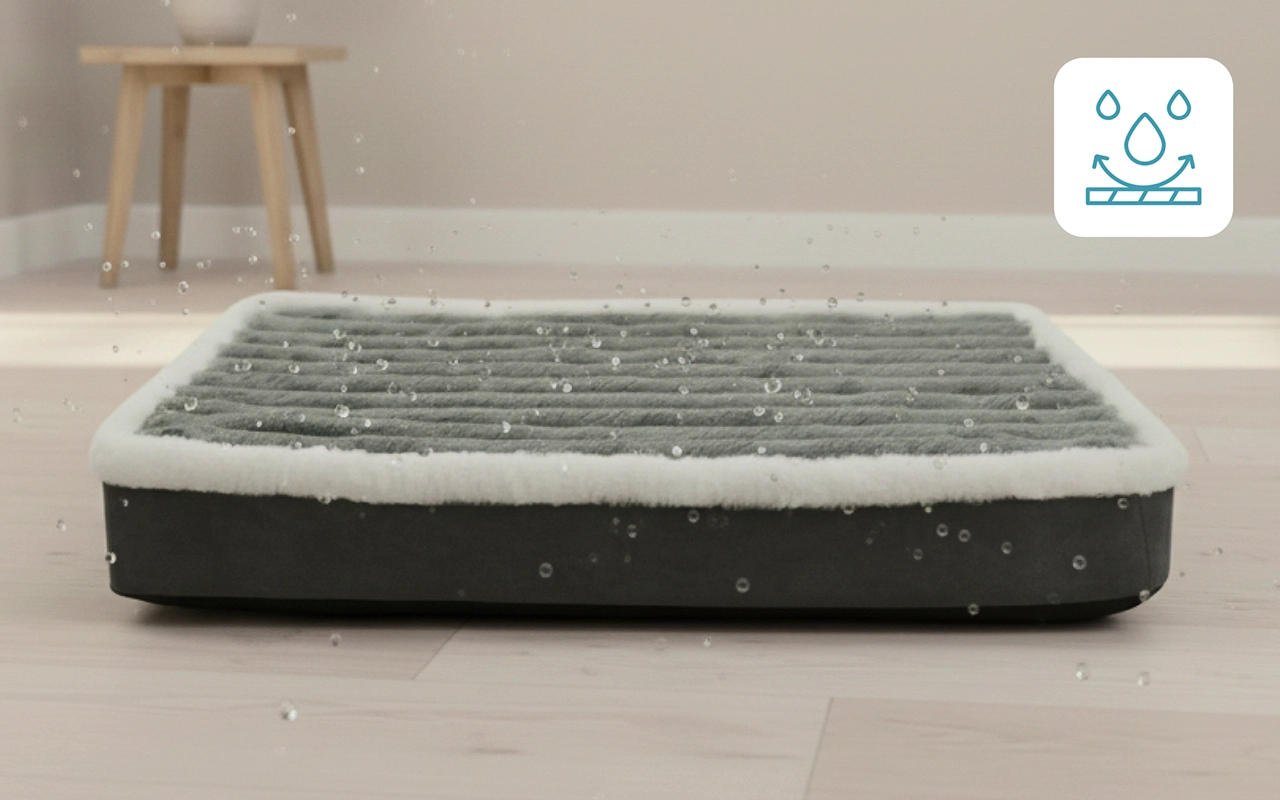 Drei strapazierfähige Schichten halten Feuchtigkeit ab und verhindern das Austreten von Flüssigkeiten. Verschüttetes und Missgeschicke beschädigen den Schlafplatz Ihres Haustieres nicht.