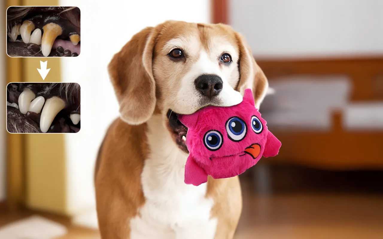 Der Plüschüberzug schützt sanft Zähne und Zahnfleisch. Das langlebige Design hält spielerischen Bissen und energischem Spaß stand.