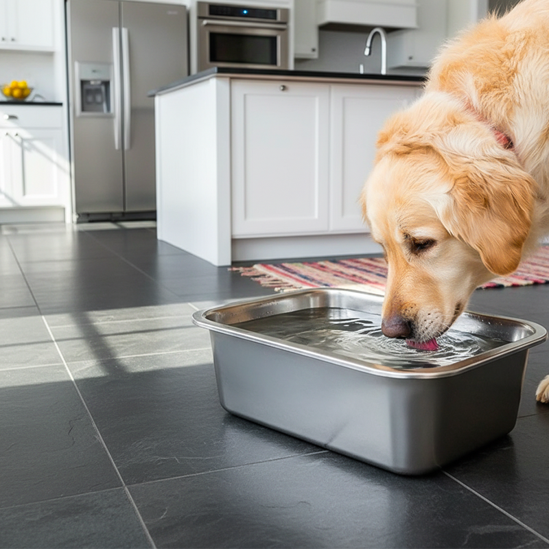 Unser Schäferhund trinkt sehr viel und dieser Napf hält sie zufrieden. Ich mag, wie ordentlich und glänzend er auf dem Küchenboden aussieht.