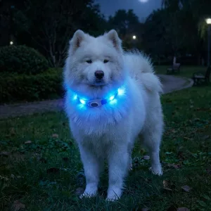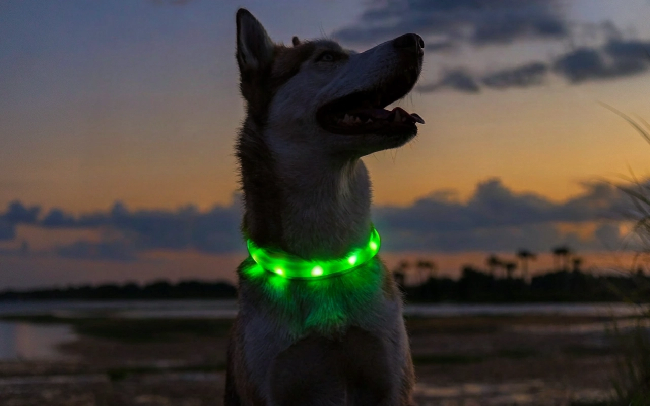 Hunde heben sich in der Dunkelheit hervor und helfen, Unfälle im Freien zu vermeiden. Helle LEDs machen Haustiere jedes Mal aus der Ferne sichtbar.
