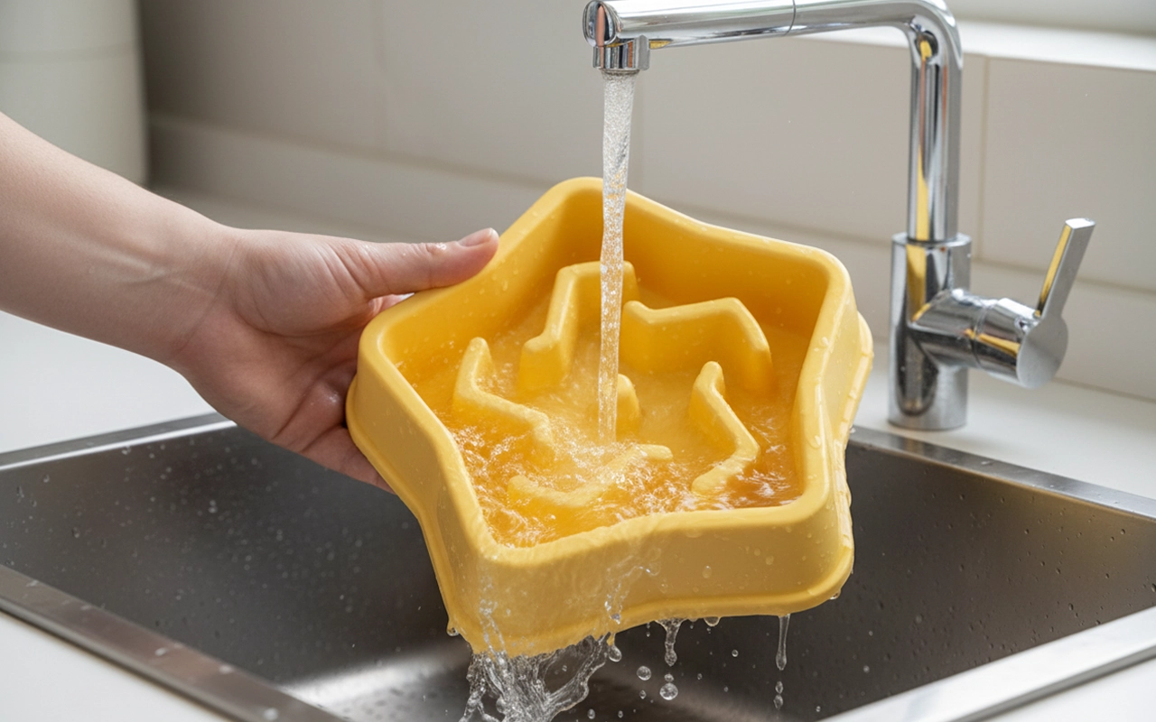 Einfach auszuspülen, mein Hund mag die Spiele beim Fressen.