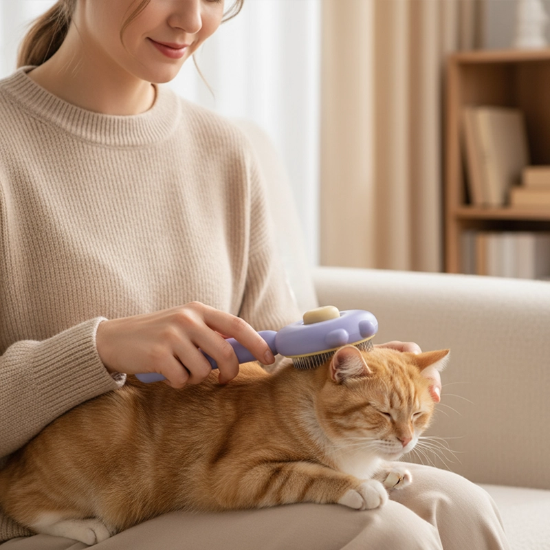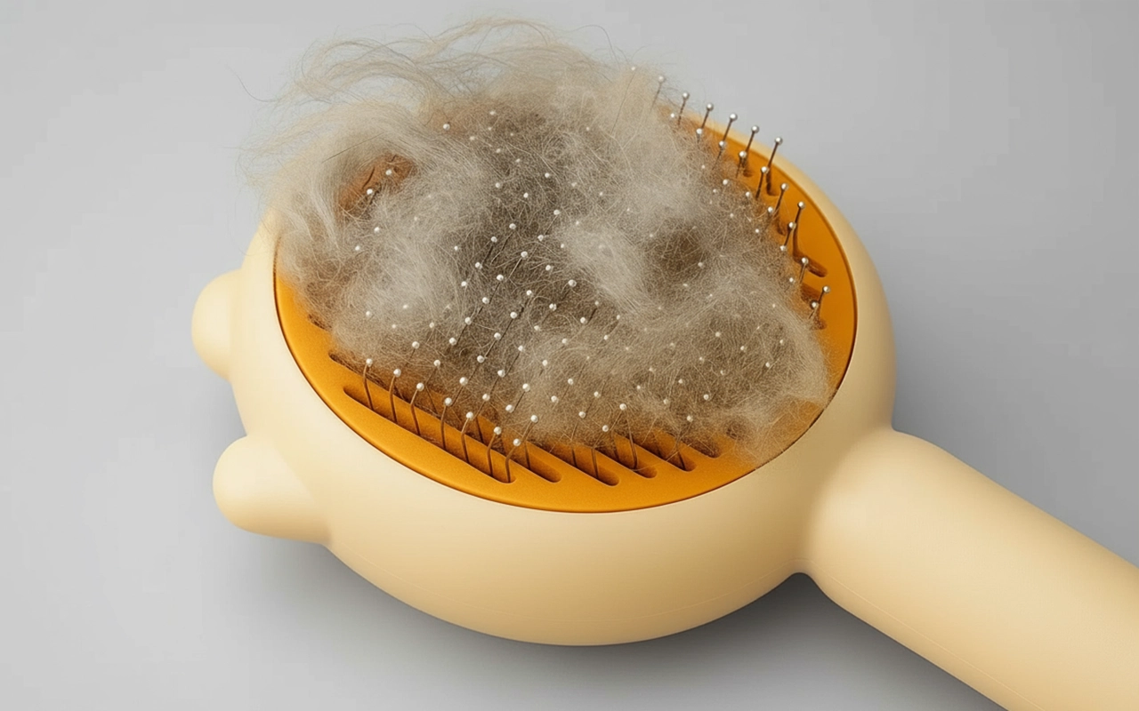 Dieses Pflegewerkzeug hält das Fell meiner Katze seidig. Früher mochte sie das Bürsten nicht, aber jetzt sitzt sie ruhig. Ein Druck und alle Haare sind ab. Super praktisch!
